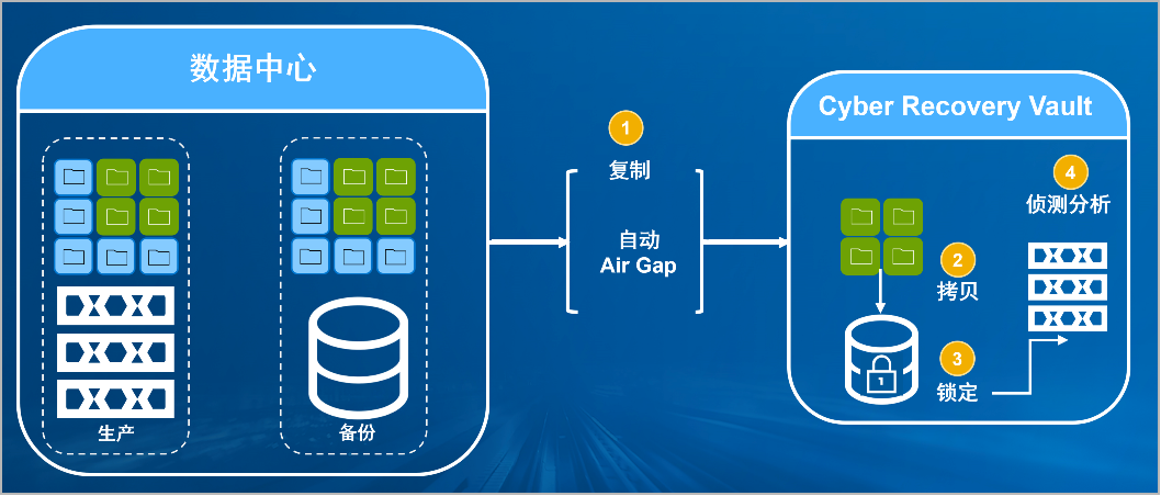 Ebpay防勒索病毒方案将生产中心备份数据复制到Vault区,复制后网络自动断开实现弹性隔离。Vault区的数据快速拷贝,并对拷贝版本加锁(在锁定期数据不允许删除和修改)。Vault沙箱内对拷贝版本进行扫描分析,验证数据是否完好。